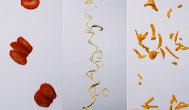 1 disc, 6 cuts! With the Thermomix® Cutter+, you can slice, grate and spiralize two different thicknesses, allowing you to prepare carpaccio-style vegetables or thicker sticks of peppers or carrots as needed: thin slice (1-2 mm), thick slice (4-5 mm), thin grate (2 mm), thick grate (4 mm), thick spirals (e.g. tagliatelle) or thin spirals (e.g. spaghetti).